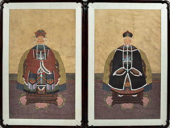 Very nice pair of framed oriental ancestral portraits of man and woman, on silk in good condtion with fine color, framed in notch corner wooden Asian style frames. Probably Chinese, late 19th century.