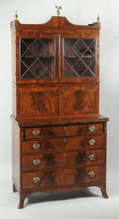 Very fine hepplewhite figured mahogany secretary desk, in two parts, the upper section with arcaded shaped cornice above two diamond mullioned glass doors, in turn above two flat paneled crotch mahogany veneered doors opening to a fitted interior with cubbies and drawers, the base with fold down writing board above four crotch veneered graduated drawers raised on flaring